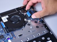 Insert the plastic opening tool underneath the connector on the black flexible flat cable with the blue plastic stripe.