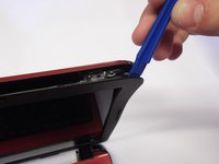Slide plastic opening tool in crack at the top corner of the outer frame of the screen (in the gap between the red and black sections of plastic) and pry apart as shown.