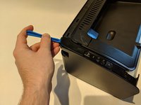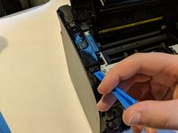 Flip printer on it's back. Using the plastic spudger, pry off front panel. There will be two main points to focus as shown.