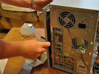 Using the #0 Phillips head screwdriver, unscrew and remove the two (5 mm) screws that fasten the remaining side panel to the tower.