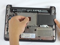 Lift the black flap covering the hard drive then slide it towards the left using the orange tab until it's released from its receptacle.