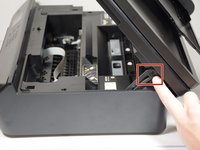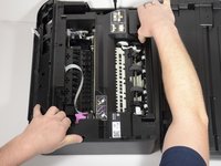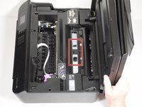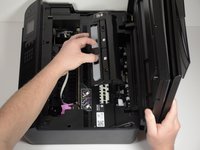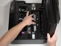 Remove the clip that keeps the printer lid from opening all the way with your hands by pulling away from the post on the lid.