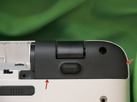 Use a guitar pick to release the plastic clips at the points shown on the black covers near the hinges.