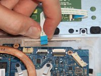 After the black tab has been flipped, pull out the blue cable to disconnect the keyboard cable.