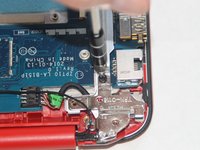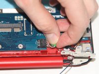 Use the spudger to pry up the blue/white speaker wires that are routed beside the battery.