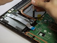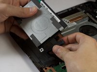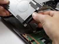 Lift up the hard drive slightly and remove the black cable strip connecting the hard drive to the computer
