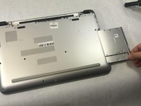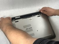 Flip computer over so that the bottom is facing the ceiling and the hinges are farthest from you.