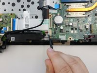Lift the motherboard up and flip it around to reveal the cable connected on the underside.