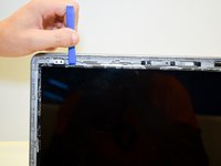 Insert a spudger or an opening tool in the top left corner and work your way around the edges of the screen to remove the black plastic bezel.