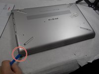 The first step is to remove the four rubber non-slip pads on the bottom of the laptop to expose screws hidden underneath them. Peel off each tab with your fingers.