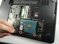 Unscrew the two black Phillips #0 screws securing the hard drive.