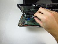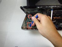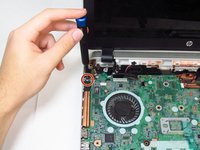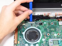 Use the tip of the blue plastic opening tool to gently flip-up the black locking flap of the cable connecting the motherboard to the display.