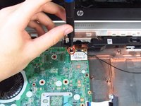 Unscrew one captive screw on the wireless card using the Phillips #00 screwdriver. The wireless card will angle upwards when the screw is removed.