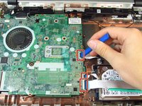 Use the tip of the blue plastic opening tool to gently flip-up the grey locking flap of the three ribbon cables on the bottom right corner of the motherboard.