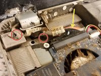 Remove the three remaining screws holding the palmrest. Use a guitar pick to separate the palmrest from the base, and then slowly lift the palmrest to reveal the power button cable. Remove it, and then put the palmrest aside. Whew!