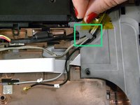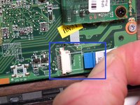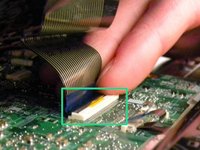 • In the upper left-hand corner of the laptop, disconnect the display panel cable by lifting the Mylar tab upwards toward the screen to release from the connector.