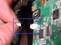 • Disconnect the connector from the system board by pulling the white tab with your thumb and forefinger.
