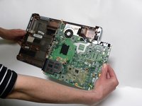• Holding the right side of the system board at the optical drive area, lift the right-side edge up at an angle. Continue lifting the board up and slide it out at at angle to remove.