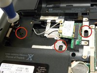 • Remove the 4 screws marked with keyboard symbols. One is located to the left of the memory module, two are in the hard drive bay, and one is in the battery bay.
