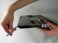 • Starting in the optical drive area, slide the plastic opening tool under the top cover, prying up each side to loosen it from the computer.