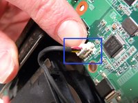 • On the side facing closest to you, pull right on the blue tab of the audio/infrared board cable to release from the connector on the system board.