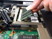 • Remove the two memory modules by spreading apart the two silver retaining tabs, using your thumb and index finger. Pull and lift the green memory module upward at a 45-degree angle, then pull the memory module out of the computer.