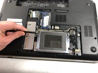 Using a plastic spudger, lift up the hard drive from the top left corner and flip it to the right of the laptop like opening a book.