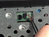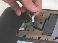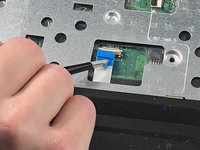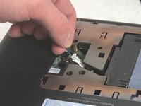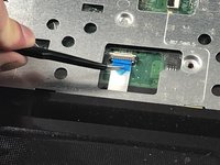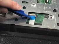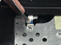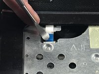 • Using tweezers or a plastic opening tool, disconnect the speaker cable from the black connector located near the right side of the laptop.