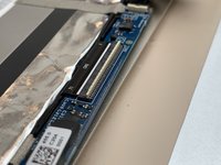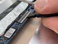 Using a plastic Spudger, remove the ZIF connectors that attach the motherboard to the touchpad and the keyboard. Use the flat end of the Spudger to pop up the cap on top of the connector. The connector will then slide out of place.