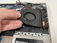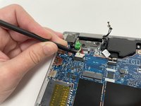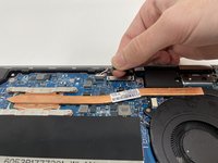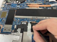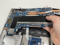 Using your other hand, lift the small part of the motherboard up and away from the laptop frame.