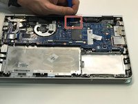 Use the iFixit opening tool to flip the cable tab up, located at the top right corner of the motherboard.