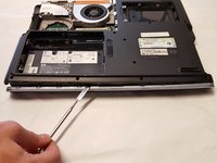 • Insert the plastic spudger into the edge of the base plate and the side of the laptop directly above the battery space and gently pry the base plate loose from its clips moving from right to left.