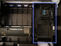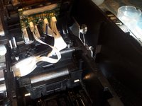 When inserting the print head after cleaning or replacing, make sure the horizontal plastic ribbon is between the plastic guides, as shown in the last picture. Getting this wrong may cause the print head to jam when you put the power back on at the end.