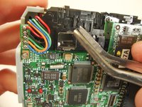 Holding the camera securely, gently pull the end of the electric strip off of the back of the camera using a pair of tweezers.