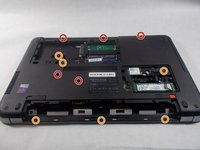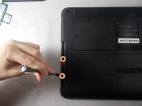 Once the battery, hard drive, and optical drive cover are removed, begin removing all of the screws on the bottom plate of the laptop.