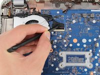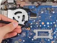 Use the spudger to gently lift the fan from the laptop.