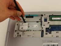 Use the spudger to press down on the two black tabs that are underneath where the hard drive used to be.