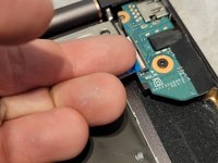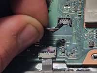 Using minimal force, lift the locking bars on the USB board ZIF connector using a plastic opening tool or fingernail and pull out the ribbon cable.