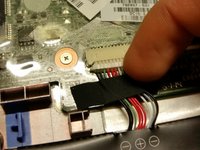 Disconnect the power button connector by peeling back the protective tape, using your fingernail to flip the white retaining clip back, and pulling the ribbon cable out