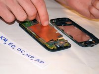 Do not peel off the two pieces of tape, that are located on the straightest edge of the RF shield closest to the edge of the phone.