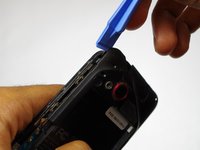 Use the plastic opening tool to pry off back cover by inserting opening tool in the space indicated and pushing down on the handle of the tool.