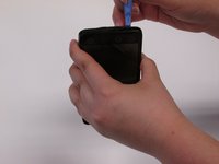 Remove the back case of the phone with a plastic opening tool by placing the tool in the tab on the back of the phone.