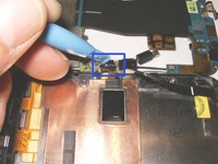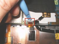The power button is adhered to a landing at the top of the frame. Use a plastic opening tool to gently loosen it of the landing.