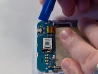 Using the tweezers or another small pointed tool, place the tip under the edge of the round disk-like component on the left side of the device. Apply a small amount of pressure to the edge of the component to dislodge it.