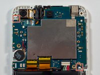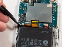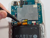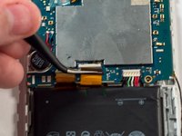 Using the tweezers or another small pointed tool, place the tip under the edge of the round disk-like component on the left side of the device. Apply a small amount of pressure to the edge of the component to dislodge it.