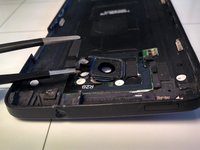 Using tweezers gently peel up from the side shown in the picture. Place the tweezers below the lens assembly on the camera flash side and gently pull up. It easily comes up.
