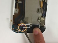 Remove the gold tape at the top right corner of the phone and disconnect the ribbon wire from the circuit board.