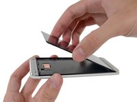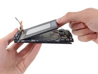 Now that the motherboard has been removed, we're finally able to access the sandwiched-in battery. After some prying and peeling, we slowly extract the well-adhered battery from the midframe.