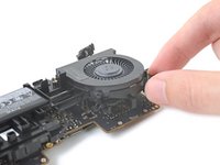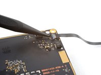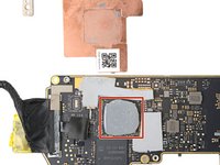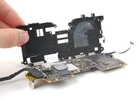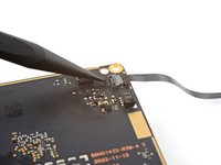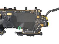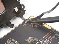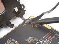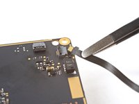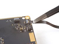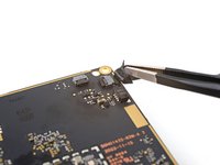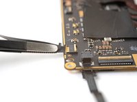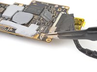 Peel off the black tape at the top right corner of the motherboard covering the volume button cable ZIF connector.
