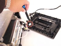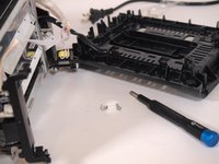 Gently lay the bottom housing down and unscrew the 10 mm screws securing the small white bracket with a Phillips #0 screwdriver.